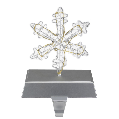 Silver wired metal snowflake Christmas stocking holder. Illuminated by 13 warm white LED micro fairy lights. Weighted base for better stability; Metal hook in the front to hold the stocking