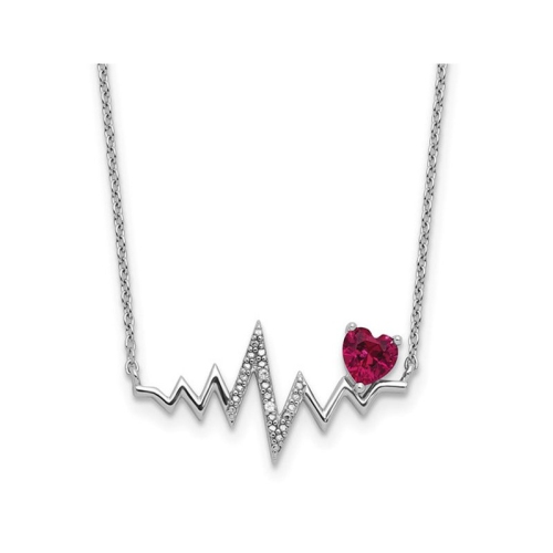 A simple and elegant heart pendant with a heart-cut lab created rich red ruby gemstone the featured birthstone of the month of the July. This heart-beat pendant is crafted from sleek sterling silver and includes an 18 inch silver chain.