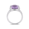 Get a charming look for your first movie date with this ravishing purple amethyst and white topaz split shank cocktail ring. Crafted in gleaming sterling silver, this priceless ring features a cushion double checkerboard cut, prong set amethyst gemstone (12x12 mm) and eight round pave set white topaz gemstones (1x1mm). Purple amethyst is the featured birthstone of February.