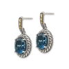 Beautiful natural oval-cut london blue topaz gems dangle from the embrace of polished rhodium plated antiqued sterling silver with yellow accents featuring the birthstone for the month of December. These dangle earrings are 1 1/5 inch in length and 2/3 inches in width.