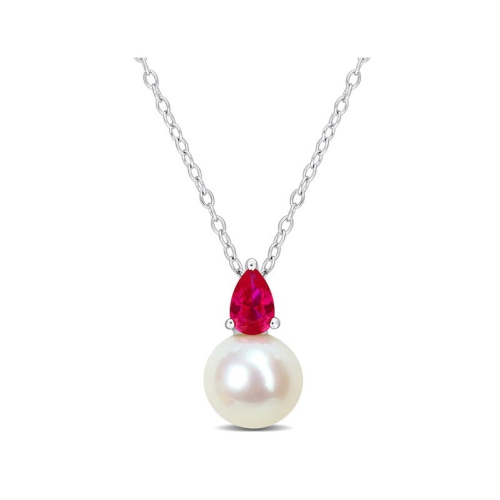 8.5-9mm Freshwater Cultured Drop Pearl Pendant Necklace with Lab-Created Ruby Sterling Silver with Chain
