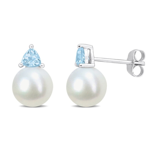 8-8.5 mm Cultured Freshwater Pearl Earrings with Blue Topaz 10K White Gold