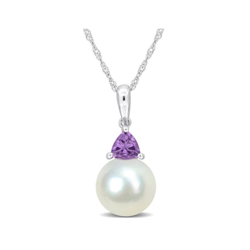 Presenting the 8-8.5mm cultured freshwater pearl and 1/5 carat (ctw) purple amethyst pendant with chain in 10 karat white gold – a graceful union of timeless pearls and vibrant amethysts. This pendant showcases a lustrous 8-8.5mm cultured freshwater pearl, symbolizing purity and elegance, harmoniously paired with a dazzling 1/5 carat (ctw) amethyst that adds a touch of regal purple allure. The pen