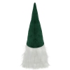 Dark green tabletop gnome head decoration. Soft plush pointed felt hat. White faux fur all around the gnome head