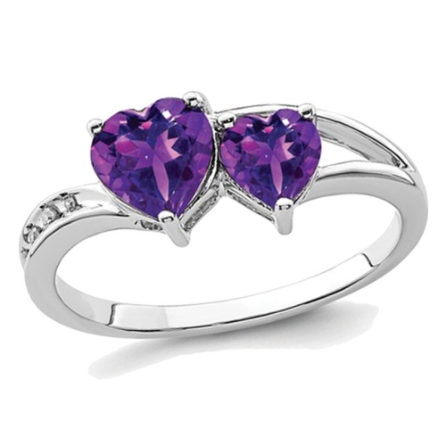 A beautiful classic double heart promise ring featuring heart shaped amethyst gemstones in a sleek sterling silver foundation. Amethyst is the Birthstone for February.