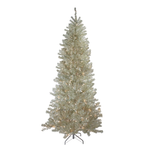 Sheer champagne retro tinsel Christmas tree. Pre-lit with 1200 clear wide-angle Christmas lights. Hinged branch construction makes set up a snap
