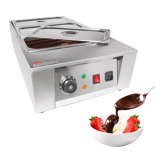 With this stainless-steel 3-tank melting pot, it is possible to warm up to 27 lb (12 kg) of chocolate and other sweet ingredients like candies, etc. The machine is electric and featured with a water-heating system. Due to high-quality materials, the appliance is reliable and can be extensively used both at home or at a bakery/cake/chocolate business. The machine looks stylish and beautiful in any interior.