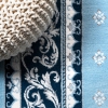 This elegant rug's medallions and acanthus leaf border are inspired by traditional French rug patterns. Our version in various shades of blue and cream is the perfect way to update a living room, bedroom, entry, office or dining room.