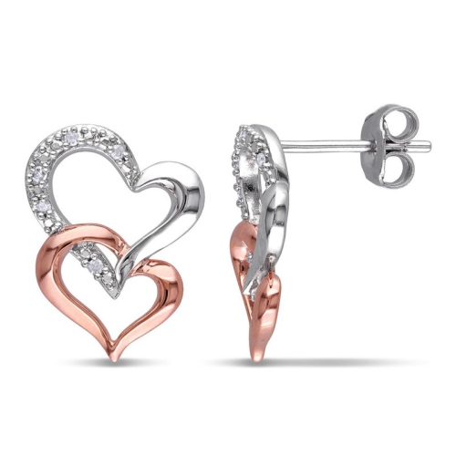 These lovely earrings each a double heart design adorned with round white diamond accents. This extraordinary pair is set in two tone sterling silver (rose plated and white) and are secured with butterfly backs.