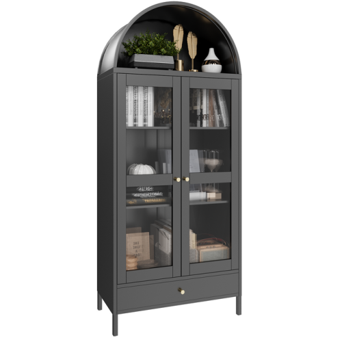 AECOJOY 73'' Arched Metal Bookcase Cabinet, Modern Kitchen Pantry with Glass Door, Drawer & Adjustable Shelves (2 Doors - Drawer)