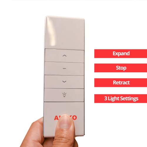 Features: Single Channel Remote Transmitter with LED Control capability Control your awning from a distance Simple, intuitive design features 4 buttons for easy control Pocket-sized remote fits easily in the palm of your hand Can be mounted for convenience Durable plastic body won’t break easily