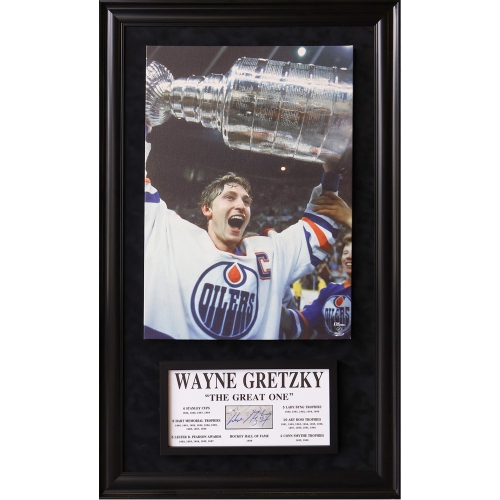Celebrate the legendary career of Wayne Gretzky with this premium plaque and canvas set. Featuring Gretzky’s iconic signature, this piece combines high-quality materials with an elegant frame, measuring 49.5 by 29.5 inches. Perfect for any hockey fan, it’s a timeless tribute to the greatest player of all time. Comes guaranteed with a Certificate of Authenticity.