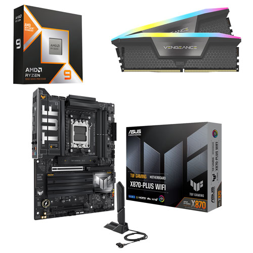 Boost your PC's performance with the AMD Ryzen 9 9900X3D AM5 processor, Corsair Vengeance RGB 32GB desktop memory, and ASUS TUF X870-PLUS ATX motherboard bundle.
