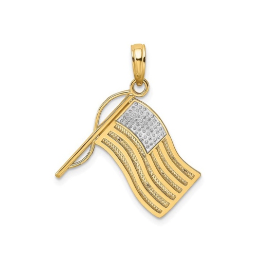 Proudly wear this classic American flag charm pendant crafted from polished shimmering 10 karat yellow gold. This flag pendant is 3/4 inches in length and 3/4 inches in width and weighs 1.63 grams. This patriotic pendant does not inlude a chain. This gold pendant has the word God Bless America engraved on the back.