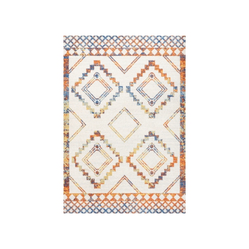 Moroccan influences abound in the geometric design of this rug. Shades of blue and orange create a lively medallion design against a trendy ivory background. Add graphic impact to a modern room, or make this rug part of your Boho-chic story.