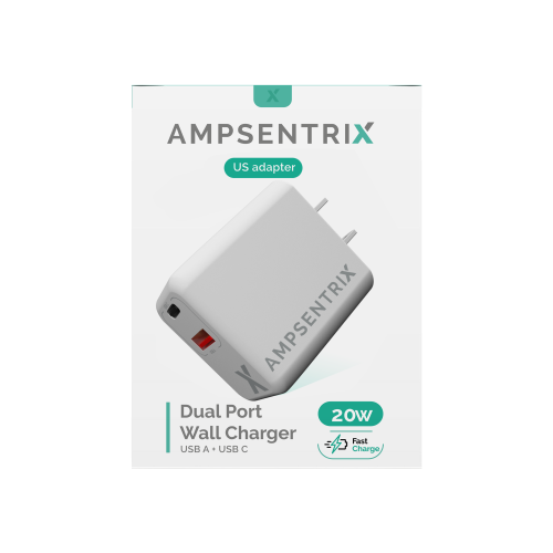 Discover the AmpSentrix 20W Dual USB Wall Power Adapter, featuring both USB Type C and Type A ports for versatile charging. This compact and efficient power adapter ensures rapid charging for your devices, whether at home, in the office, or while traveling. Enjoy the convenience of a dual plug design that allows you to power multiple devices simultaneously. Experience the quality and reliability of AmpSentrix with this essential charging accessory.