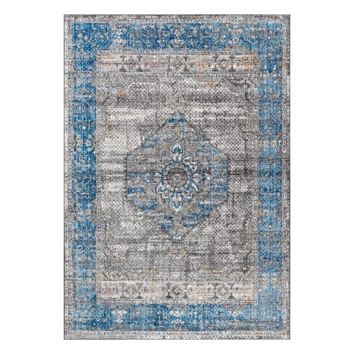 Based on a vintage medallion rug design, Anatolia mixes peacock blue and shades of gray for a modern color palette. A central medallion in peacock blue sits on a mingled gray background. An ornate border in peacock blue accented with mustard yellow completes the design.