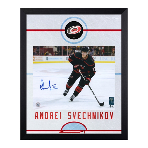 Andrei Svechnikov Signed Carolina Hurricanes Graphic Rink 19x23 FrameThe 11x14 photo in this frame is hand-signed by Andrei Svechnikov.AJ Sports frame design features a top view graphic of a hockey rink.Carolina Hurricanes logo puck slice is mounted at centre ice.Andrei Svechnikov is pictured with Carolina in this striking hockey photo.Frame...