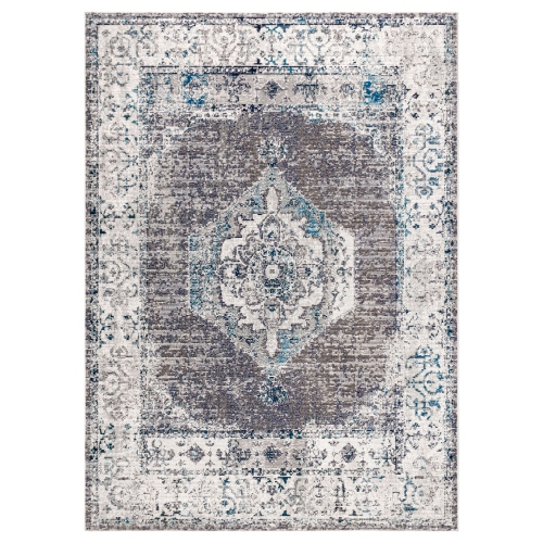 A modern gray and ivory color scheme updates this timeless medallion rug design. Mingled shades of gray and an overall faded effect give this rug a vintage vibe, perfect for the living room, den, dining room or bedroom.