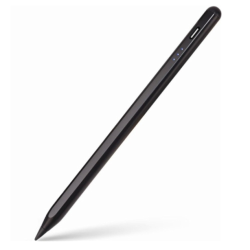 This is a third-party capacitive stylus compatible with iPad models released in 2018 and later. It features tilt pressure sensitivity and palm rejection, charges via USB-C, and has three battery indicators: a flashing blue light while charging and a solid blue light when fully charged. While suitable for everyday writing and drawing, it lacks the pressure sensitivity and magnetic pairing features of the original Apple stylus.