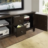 ·Functional and versatile TV Stand features a large centrally located open area with four side drawers as well as two enclosed spaces. The two large side storage cabinets open to one adjustable shelf each. The unit features cord management cut-outs for easy installation of TV and media components