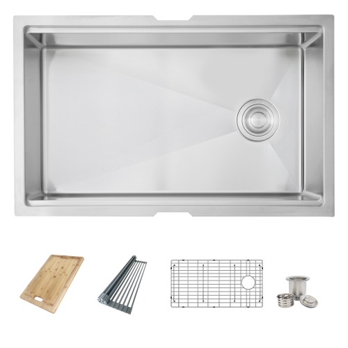 Create a sophisticated kitchen look with our AZUNI Sinks. Featuring this 30" x 19" x 10” Undermount Kitchen Sink. This workstation kitchen sink combines the best of both world: a bold stainless-steel single bowl sink with a functional workstation: built-in accessories that slide on the integrated tracks in the sink. This stainless-steel kitchen sink includes one luxury basket strainer, one drying rack, one bamboo cutting board and one bottom grid made of 100% stainless steel which will really help to protect your sink from dents or scratches. Handcrafted using premium 304 stainless steel with 16 gauge and 18/10 chrome/nickel content and featuring a refined brushed finished.