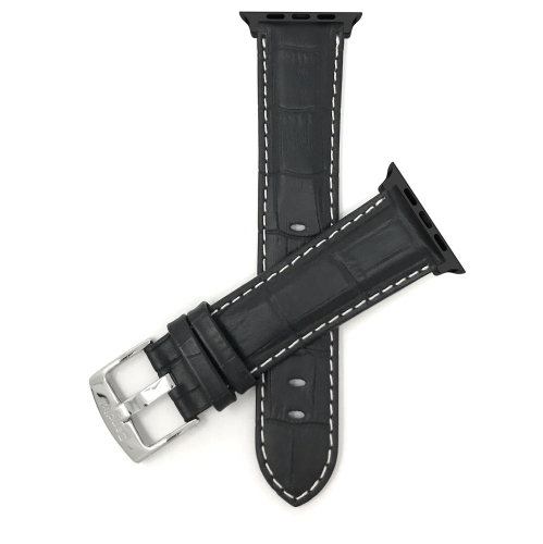 Bandini Black / White Stitch Leather Watch Band Replacement for Apple Watch 42mm (Series 11, Series 10), 41mm, 40mm and 38mm, For Series 11, Series 10, Series 9, Series 8, Series 7, SE, Series 6, Series 5, Series 4, Series 3, Series 2, Series 1 for Men and Women (Unisex) - Alligator Pattern - Black Connector Adapter