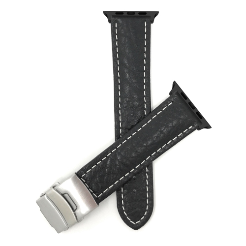 Bandini Black / White Stitch Leather Watch Band Replacement for Apple Watch 46mm / 49mm / 45mm / 44mm / 42mm (Series 3), Ultra 1, Ultra 2, Series 11, Series 10, Series 9, Series 8, Series 7, SE, Series 6, Series 5, Series 4, Series 3, Series 2, Series 1 for Men and Women (Unisex) - Deployment Clasp - Black Connector Adapter