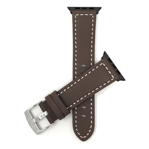 Bandini Brown / White Stitch Leather Watch Band Replacement for Apple Watch 46mm / 49mm / 45mm / 44mm / 42mm (Series 3), Ultra 1, Ultra 2, Series 11, Series 10, Series 9, Series 8, Series 7, SE, Series 6, Series 5, Series 4, Series 3, Series 2, Series 1 for Men and Women (Unisex) - Thick Racer - Black Connector Adapter