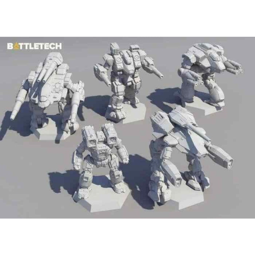 The Clan Heavy Star is a collection of five plastic miniatures for use in the classic BattleTech tabletop and Alpha Strike games. The box also provides five dry-erase cards, which are intended to directly support Alpha Strike gameplay, and five new Clan Pilot Cards.