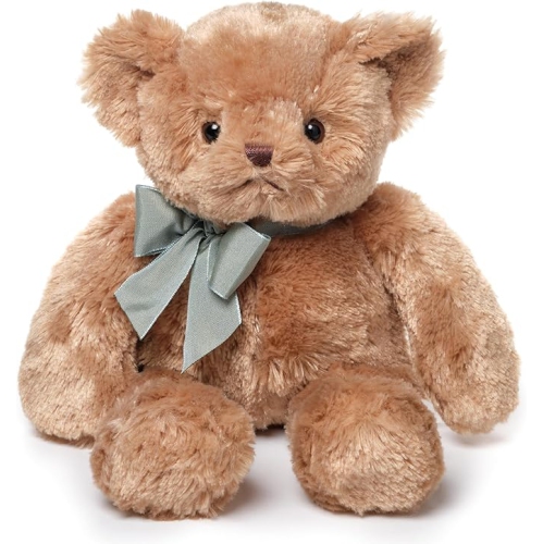 BABY GUS TEDDY BEAR: Classically cute 14" tall brown plush toy stuffed animal teddy bear with soft fur, hand stitched nose and satin bow, surface washable
