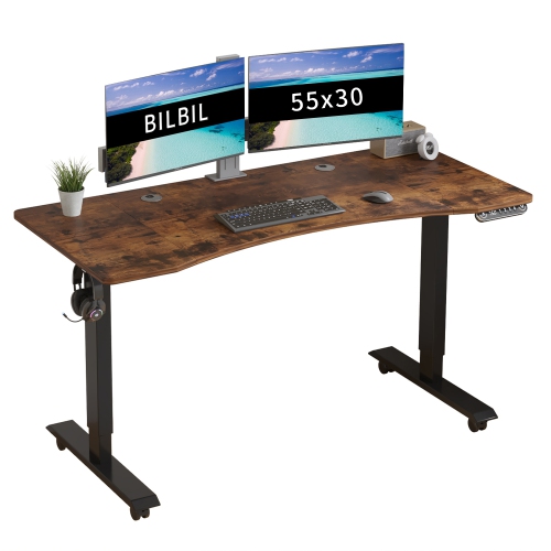 Bilbil Electric Height Adjustable Standing Desk with Memory Settings - with Curved desktop - 55″ x 24″ - Black Frame/Rustic Brown Top