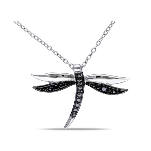 The black diamond accent sterling silver dragonfly pendant is unique and eye catching. Crafted with black rhodium plating and diamond illusion detailing, this gorgeous, fashion forward pendant features an artfully designed dragonfly. This shimmering piece includes a sterling silver pendant chain, 18 inches, that fastens with a spring ring clasp.