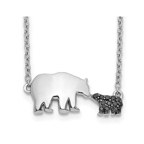 This animal charm pendant of baby and mother featuring 12 bold black accent diamonds all set into a striking crisp 14 karat white gold foundation and includes an 18 inch chain.