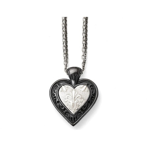 Modern and stylish, this beautiful heart pendant is crafted in strong polished black titanium with stelring silver and hangs from a 22 inch chain. This heart necklace is 1 1/5 inches in length and 1 inches wide and weighs approximately 28.92 grams.