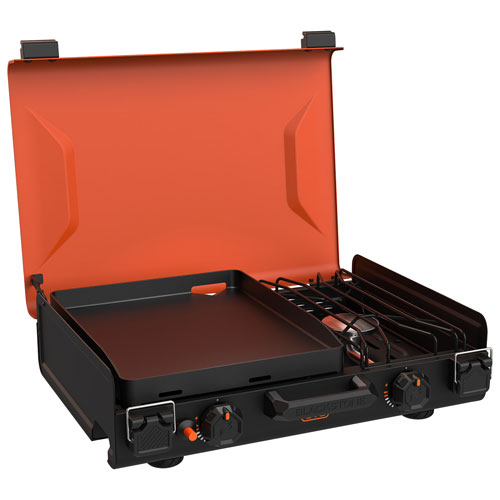 Take your cooking outdoors effortlessly with the Blackstone On-The-Go camping griddle. This 14-inch griddle features a main burner and a side burner, allowing you to cook and heat multiple dishes at different temperatures. The Propane-Chain system lets you fuel two compatible units from a single propane tank. A latching hood and handle keep the griddle secure and easy to carry.