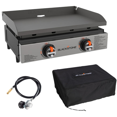 Cook like a pro anywhere with the Blackstone Original tabletop griddle bundle. This bundle has a 22-inch griddle and propane tank adapter hose with regulator. The griddle features two burners delivering a total of 24,000BTU for fast, even cooking. The two independently controlled heat zones allow cooking of main and side dishes at different temperatures simultaneously.