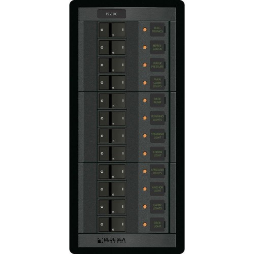 12 Volt DC 12 PositionFeatures:4 to 32 branch circuits with installed 15 Ampere circuit breakersAvailable with voltmeters, ammeters, and digital multimeters Includes 4205-Square Format Label SetSpecifications:Positions:12Nominal Voltage:12V DCMaximum Amperage*:100A per busHeight:10.75" (273.05mm)Width:4.88" (123.95mm)Depth:3.