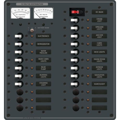 Main + 22 Positions(16) 15A Single Pole Circuit Breakers(1) 100A C-Series Main Circuit Breaker(1) 8028 DC Micro Voltmeter(1) 8250 DC Analog Micro AmmeterWhite SwitchesFeatures:All positive, negative and grounding buses installed, fully pre-wired Panels with meters include toggle switch for mounting up to 3 battery banks All panels with analog