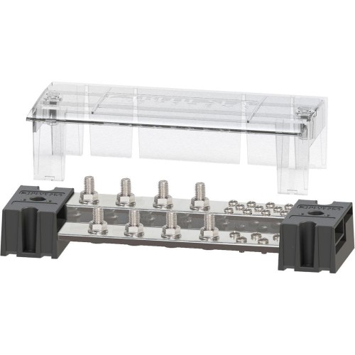 PowerBar 1000 - 8 3/8" Terminal Studs w/CoverComplex wiring systems require a single point to consolidate large and small conductors. The PowerBar 1000 offers a 1,000 Amp busbar with various size studs and screws to connect conductors and fuse blocks.Features: 1,000 Amp busbar for large complex wiring systems Tin plated pure electrical copper fo