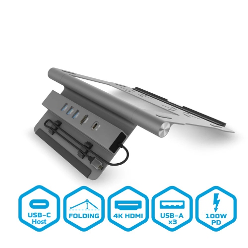 This USB/HDMI Docking Station + Laptop Stand offers a two-in-one solution for productivity and convenience. Its clever design integrates a docking station and adjustable laptop stand, making it easy to find the perfect viewing angle. Featuring a 45cm USB-C cable for fast data transfer and power, it supports 4K HDMI output at 60Hz, along with 3 USB-A 3.0 ports for high-speed data transfer. A dedicated USB-C port provides 100W Power Delivery to charge devices quickly.
