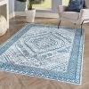 This ornate medallion rug has a geometric pattern that adds modern Bohemian style to a living room, bedroom, entry or kitchen. Varied tones of turquoise mingled with a gray and ivory background give this rug a hand-woven, vintage vibe.