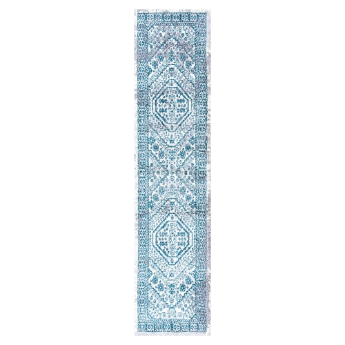 This ornate medallion rug has a geometric pattern that adds modern Bohemian style to a living room, bedroom, entry or kitchen. Varied tones of turquoise mingled with a gray and ivory background give this rug a hand-woven, vintage vibe.