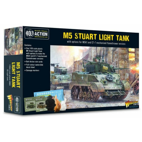 Bolt Action American M5 StuartThis new versatile plastic kit can be assembled as either an M5 Stuart, M5A1 Stuart or an E7-7 Mechanised Flamethrower, and to boot is suitable for many a Bolt Action army, including US, British, Soviet and Chinese.p data-mce-f...