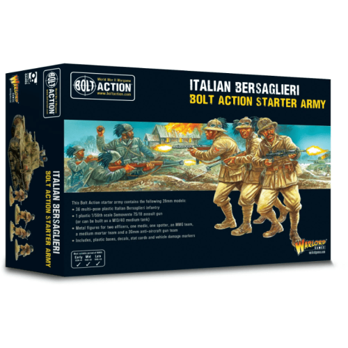 This Bolt Action starter army provides a great value core to your new Bersaglieri army. Whether you wish to build your light infantry to fight in the Battle of France, the campaigns in Africa and Sicily or the brutal fighting on the Eastern Front, these highly detailed plastic and metal figures have stacks of variety and options. Helmets and sun helmets sporting the Bersalgieri's distincti...