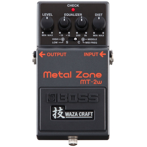 For over 25 years, the MT-2 Metal Zone has been one of the most popular and influential compact pedals in the BOSS lineup, with overall sales that are second only to the venerable DS-1 Distortion. Made in Japan and infused with Waza Craft mojo, the MT-2W takes the iconic stomp to new levels of tonal range and versatility. Standard mode delivers an evolved version of the original mid-focused Metal Zone tone, while Custom mode introduces a fresh, wide-ranging voice that's perfectly suited for today's diverse high-gain styles.