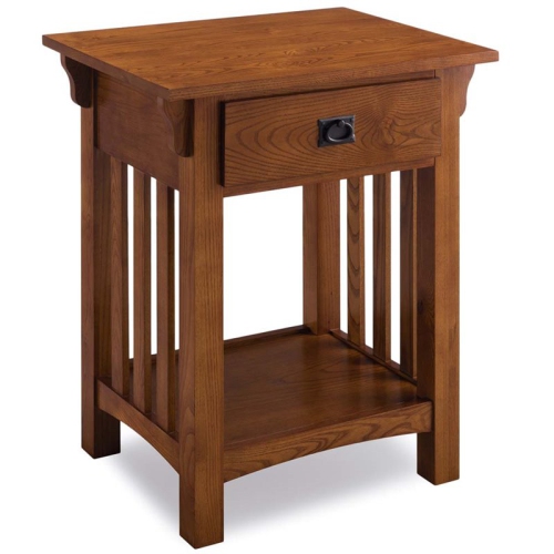 The combination of blackened ironware, slatted elements, and corbel supported overhanging tops make this the ultimate nightstand. Built from solid, North American ash lumber and protected with a durable, hand rubbed finish, all it takes is a few minutes to attach the slatted post assemblies and your home's newest addition is at your service.Features:Finish: Medium OakMaterial: Solid AshFull extension ball bearing drawer guides...
