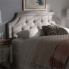 With its quality finishes and classic look, this fabric upholstered headboard with solid rubberwood legs is available in a range of warm hues to complement your look. Romantic bedhead shape with exquisite corners and curves, putting a modern edge on classic design. Constructed of solid rubberwood and MDF, the Nadeen queen size headboard is upholstered in durable Grayish beige polyester fabric. Featuring deep button-tufted design for a classic look, the headboard is sup...
