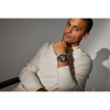 The silver-tone stainless steel case features brushed finishing with polished accents, a deep blue bezel, a flat mineral crystal, and a screw-down crown. The striking blue dial has a running seconds sub-dial with orange accents. The open heartbeat automatic movement features 21 jewels and a 42-hour power reserve. The 45mm watch is complemented with a matching silver-tone stainless steel bracelet with a push-button deployant clasp. The watch is water resistant to 200m.