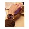 Bulova men’s Surveyor features a rose gold-tone stainless steel case, a matching bracelet and a sapphire crystal. The aubergine dial has a sunray finish and with rose gold-tone accents, luminous hands, applied minute markers, and a magnified date display. The watch features a automatic movement with 21-jewels and a 42-hour power reserve, which can be seen in the mineral crystal exhibition window.